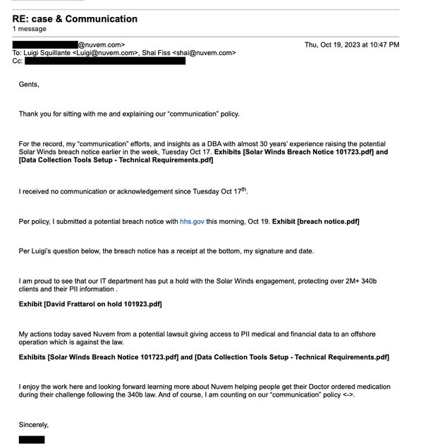 Oct 19, 2023 10:47 pm Plaintiff states; "Thank you for sitting with me and explaining our "communication" policy.... I received no comminucation or ascknowledgment since Tuesday Oct 17th. Per policy, I submitted a potential breach notice with hhs.gov this morning, Oct 19. Exhbit [breach notice.pdf... I am proud to see that our IT department has put a hold with the Solar Winds engagment, protecting over 2M+ 340b clients and their PII information... My actions today saved Nuvem froma potential lawsuit giving access to PIII medical and finacnial data to an offshore operation which is against the law..."