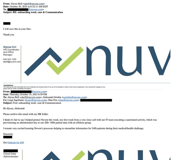 Oct 19, 2023 8:59 pm Plaintiff states: "Please archive this email with my folder. I think it's fair to say I helped protect Nuvem this week, my first week from a very close-call with our IT team executing a sanctioned activity, which was provisioning an administrator key yo our 2M+ 340b patient data with an offshore group."